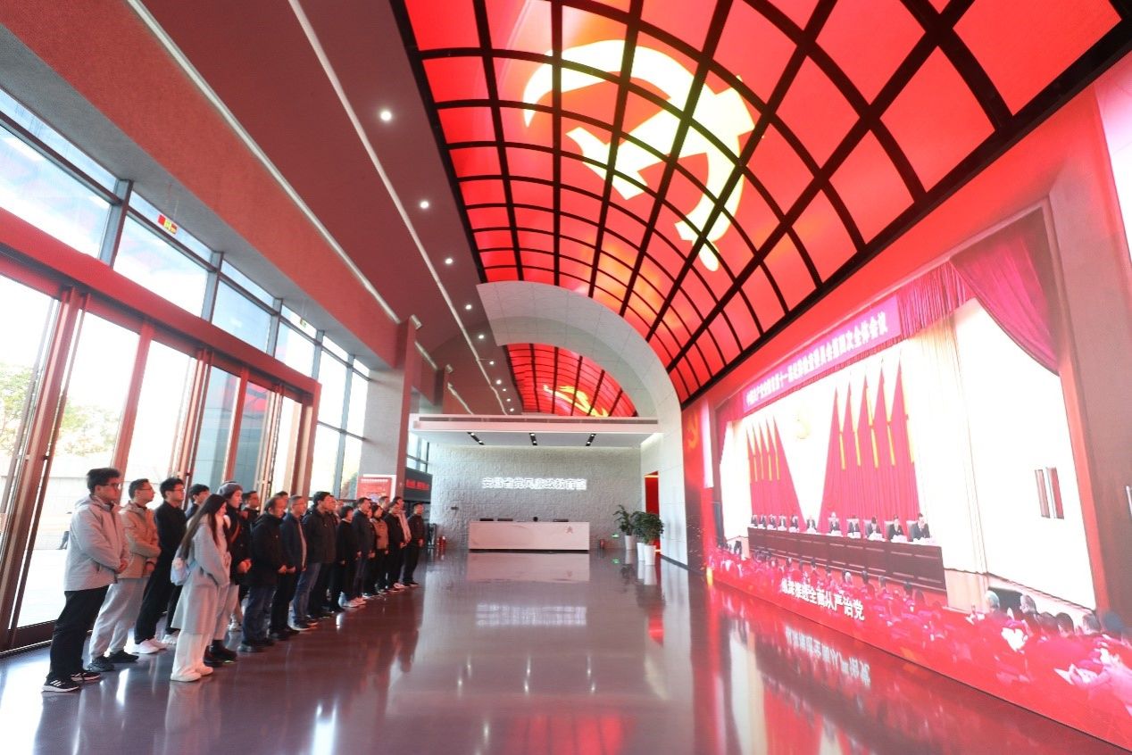 在宣誓厅,全体人员面对党旗举起右拳集体宣誓,重温入党时的庄严承诺。