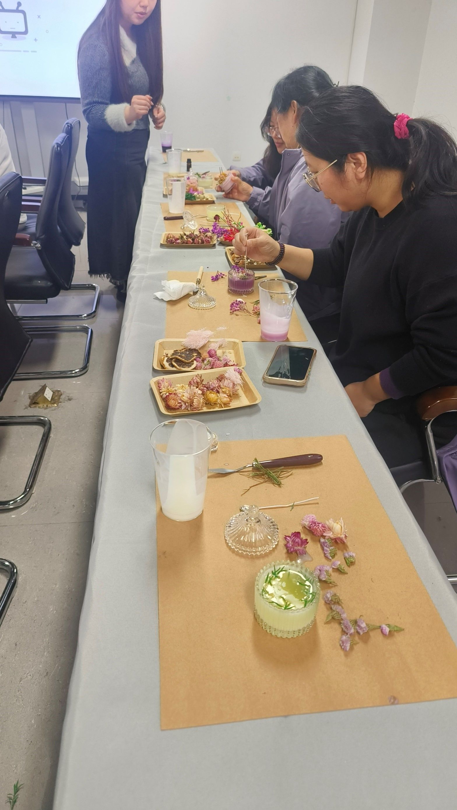 活动现场,专业老师首先为大家讲解了香薰文化的历史渊源、精油种类及功效、香薰制作步骤等知识。在老师的指导下,女教职工们纷纷化身“调香师”,挑选心仪的精油,按照比例调配,并加入干花点缀,精心制作出独一无二的香薰蜡烛。活动现场香气四溢,欢声笑语不断,大家互相交流制作心得,分享生活趣事,感受着节日的喜悦和学院的关怀。