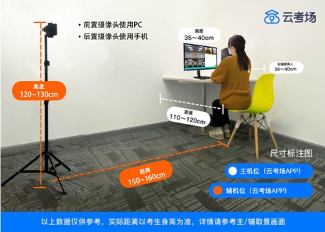 考生须准备主副两台具有摄像功能的设备,并在复试场所选择墙角位置,参照下图摆放座位。主设备为电脑,下载腾讯会议平台,摆放于考生正面;副设备为手机,安装钉钉,摆放于考生侧后方,与考生后背面约成 45°角,能够全程拍摄考生本人和电脑屏幕,复试全程开启。另准备一部电话,用于应急联系。