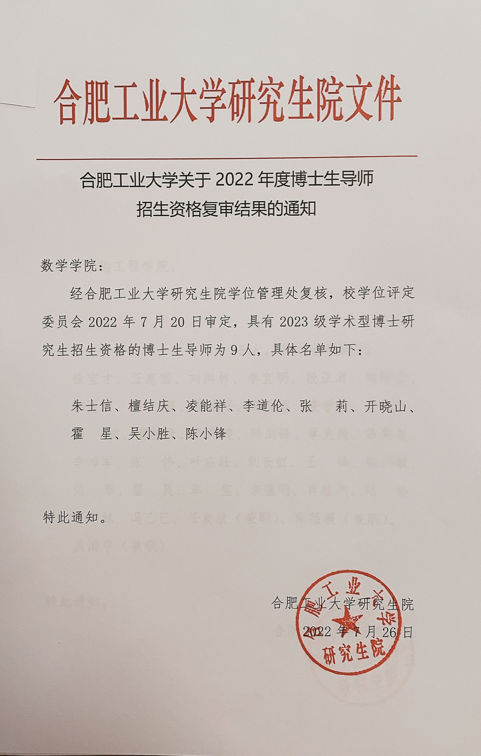 公示:合肥工业大学2022年度博士生导师招生资格的复审结果