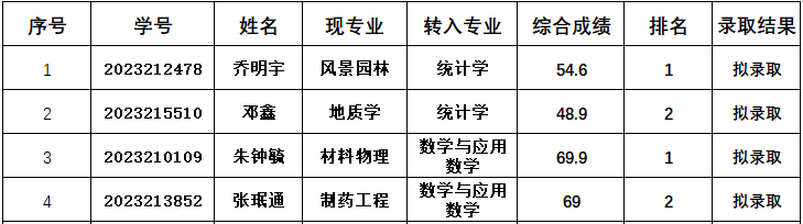 根据《合肥工业大学普通全日制本科生转专业管理暂行办法》(合工大政发〔2024〕70号)(以下简称《暂行办法》),经学院组织的笔试和面试考核,按考核总成绩高低进行排序,提出拟录取名单。数学与应用数学2人、统计学2人,现对拟录取名单予以公示。