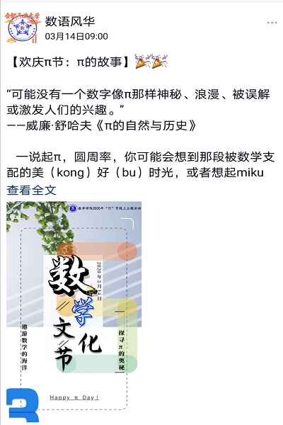 为了促进疫情期间学生身心和谐,涵育文化素养,深化疫情居家第二课堂不断线,激发学生参与数学、探讨数学、热爱数学的热情,3月14日开云app登录入口2020年“π”节活动依托网络平台多渠道、全方位开展。