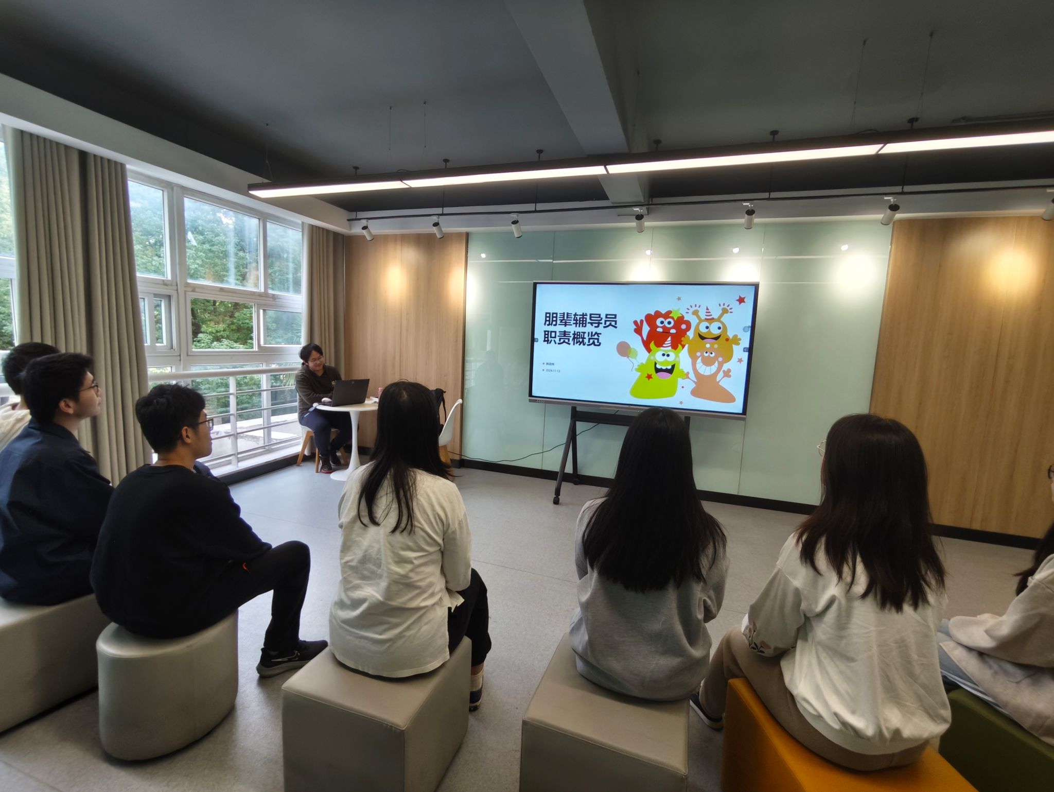 在活动的第二部分,结合阅读心得,23级王越同学担任主讲人,围绕“朋辈辅导的技能技巧与实践”主题展开分享,内容主要涵盖朋辈辅导的基本概念,朋辈辅导的技巧,朋辈辅导案例实践以及拓展知识。在分享中,王越结合自己的班级工作经历,分析了目前班级同学可能遇到的心理困惑,包括学业困难,恋爱困扰,社交困扰等,以及如何联系其他班委针对存在心理困扰的同学展开朋辈辅导,形成合力的方式技巧。最后他建议,作为心理委员,要对同学们的状态有一个比较敏锐的把握,经常与辅导员老师沟通交流。